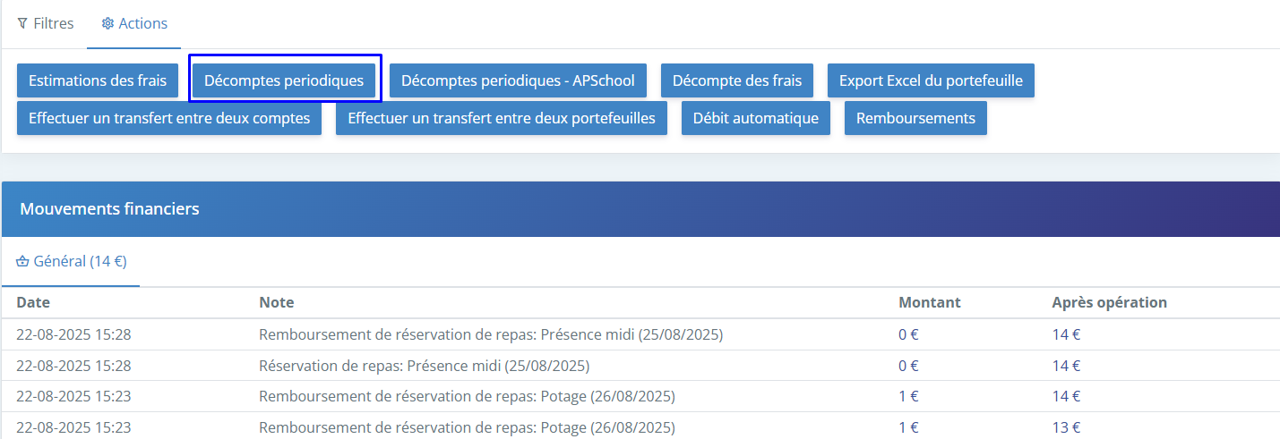 Dans l'onglet "Actions" au dessus de cette page vous trouverez le bouton "Décomptes périodiques"